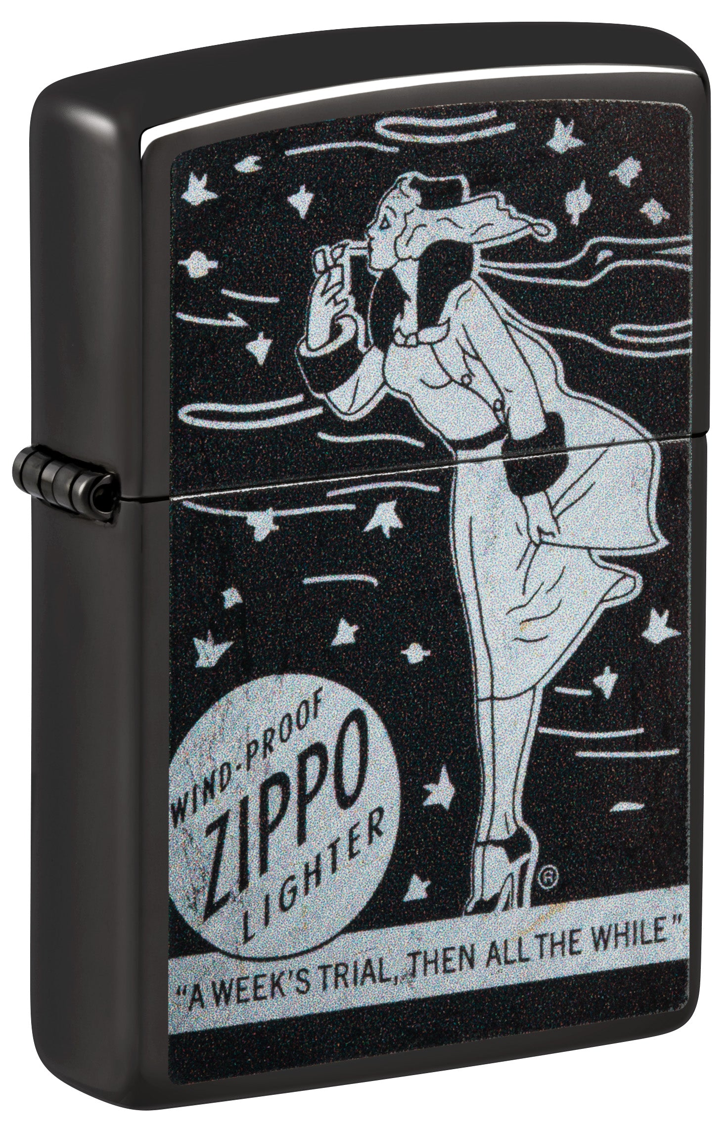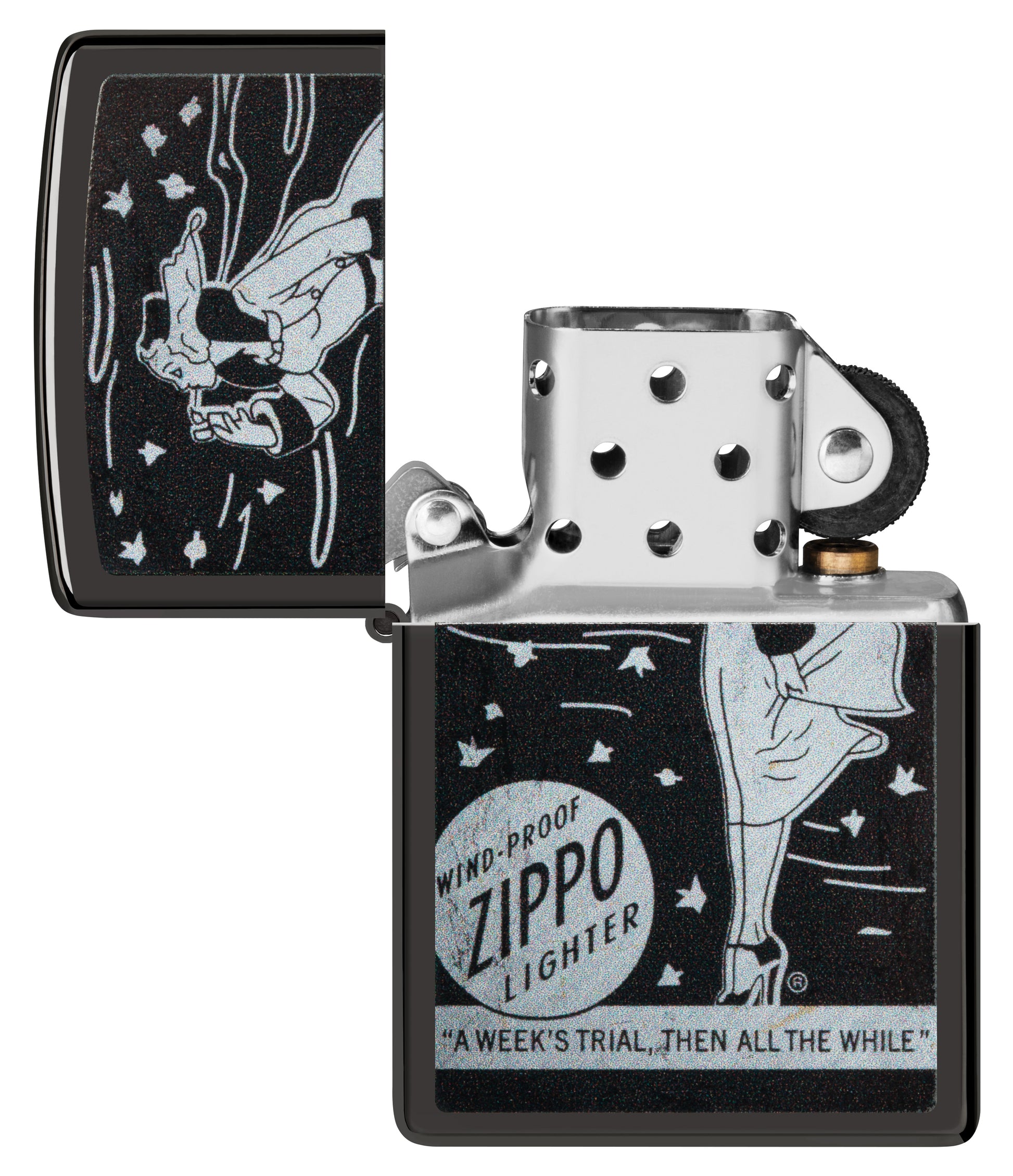 Windy, unser beliebtes Werbemodell, sieht auf diesem High Polish Black-Feuerzeug glamourös wie immer aus. Das monochromatische Color Image Design sieht auf dem tiefglänzenden Hintergrund besonders luxuriös aus.