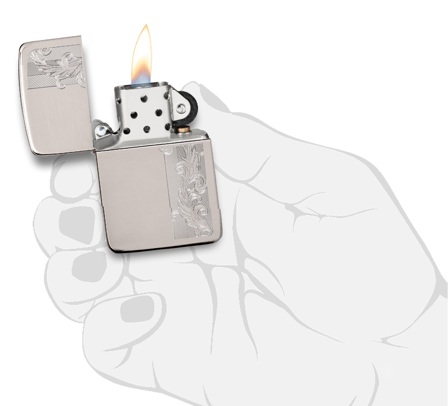 Ein elegantes Fischgräten- und Filigranmuster entsteht durch das Zippo Rotary-Gravurverfahren und verleiht der Vorder- und Rückseite des 1941 Replica Feuerzeugs aus Sterlingsilber mit Satin-Handfinish einen Hauch von Art Nouveau. Das Feuerzeug wird in einer hochwertigen Geschenkbox geliefert. Für beste Funktionalität mit Zippo-Feuerzeugbenzin befüllen.