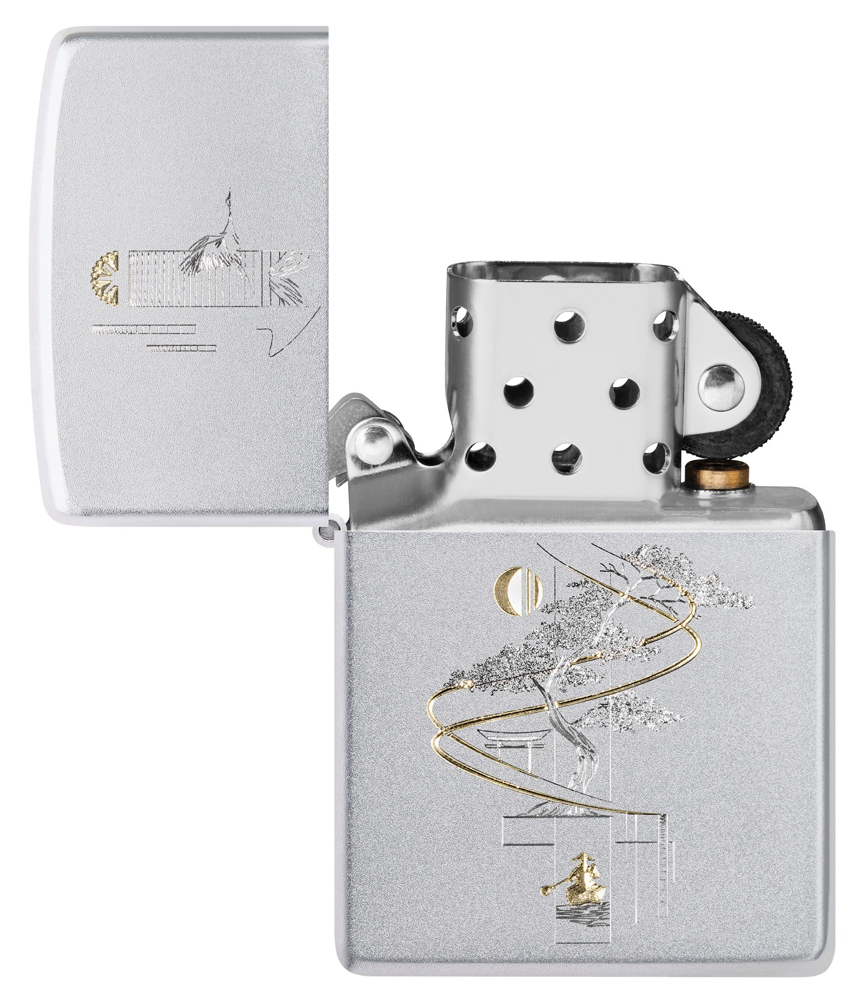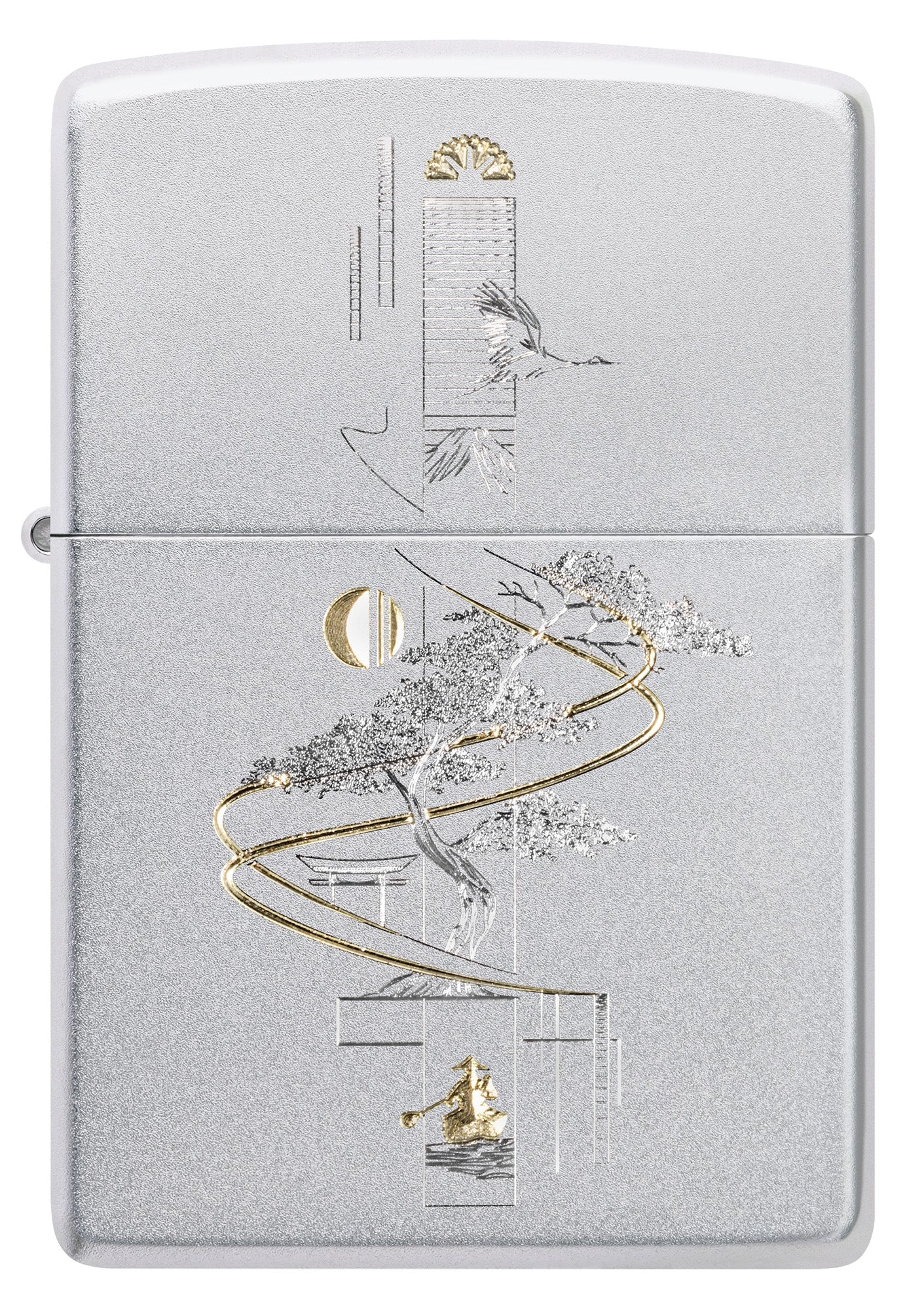 Als Symbol für die Harmonie zwischen Kunst und Natur ist auf diesem klassischen Feuerzeug aus satiniertem Chrom ein zarter Bonsai in einem beruhigenden, zweifarbigen Design abgebildet.
