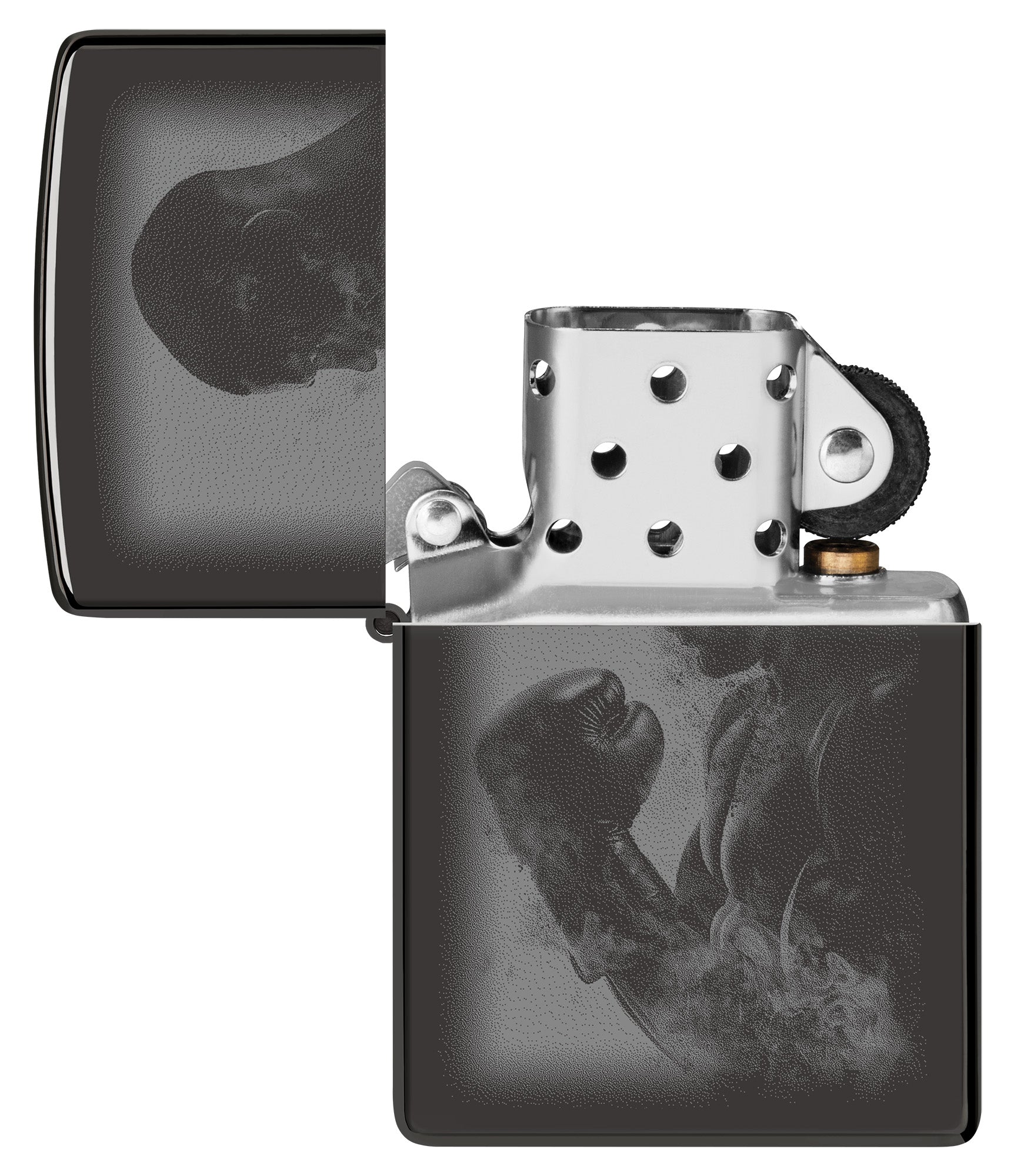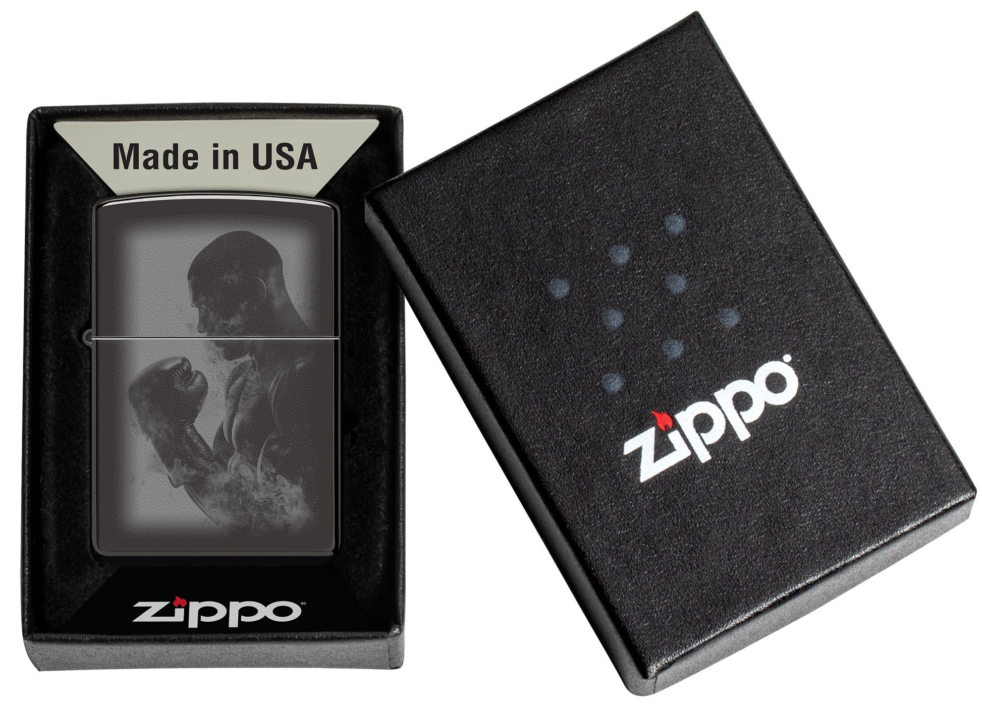 Das Herz eines Champions gibt niemals auf, und dieses klassische Feuerzeug in glänzendem Schwarz auch nicht. Boxer sind bekannt für ihre Hingabe, Disziplin und mentale Stärke. Dieses Feuerzeug zeigt einen Boxer in Kampfhaltung in einem rauchigen Fotodesign.