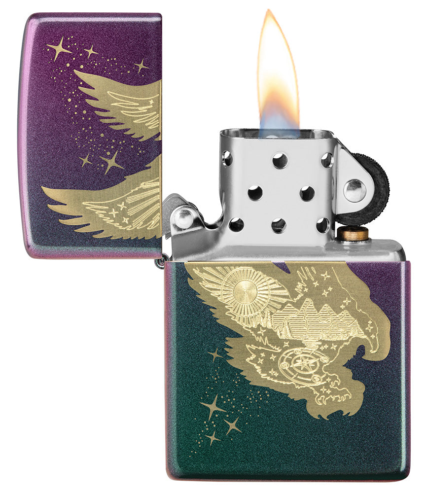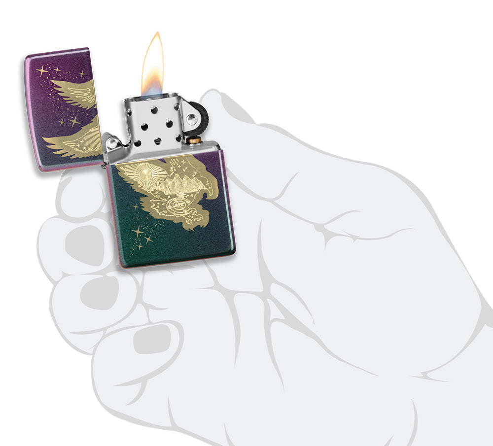 Tauche ein in die faszinierende Welt des Adlers. Sein irisierender Glanz, das kunstvolle Adlermotiv und die hochwertige Verarbeitung machen es zu einem begehrten Accessoire für alle, die Stil und Individualität schätzen. Lasse dich von dem funkelnden Sternenhintergrund und dem Farbspiel von Violett zu Dunkelgrün verzaubern und genieße die zeitlose Eleganz dieses außergewöhnlichen Feuerzeugs.