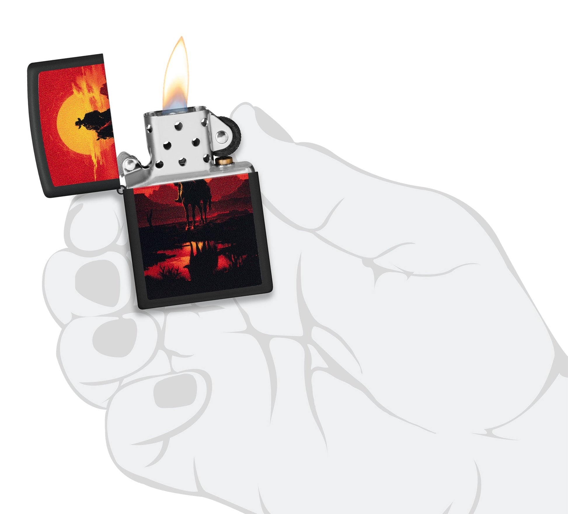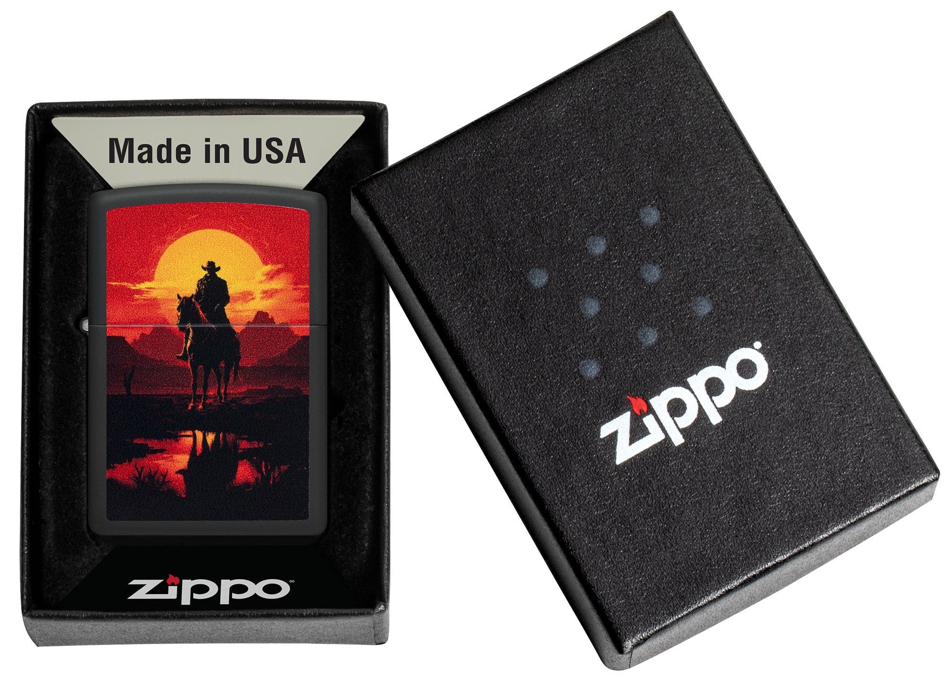 Vor dem Hintergrund eines glühenden Sonnenuntergangs in der Wüste posiert ein Rancher zu Pferd – ein lebendiges Farbbild auf der Oberfläche dieses klassischen Feuerzeugs in Mattschwarz.