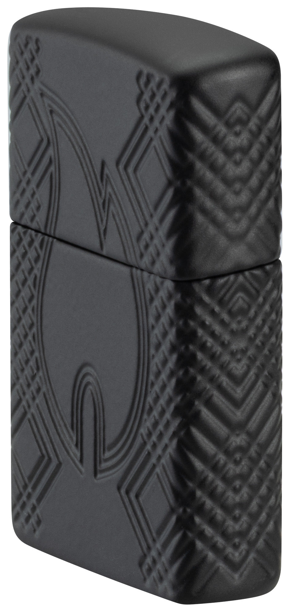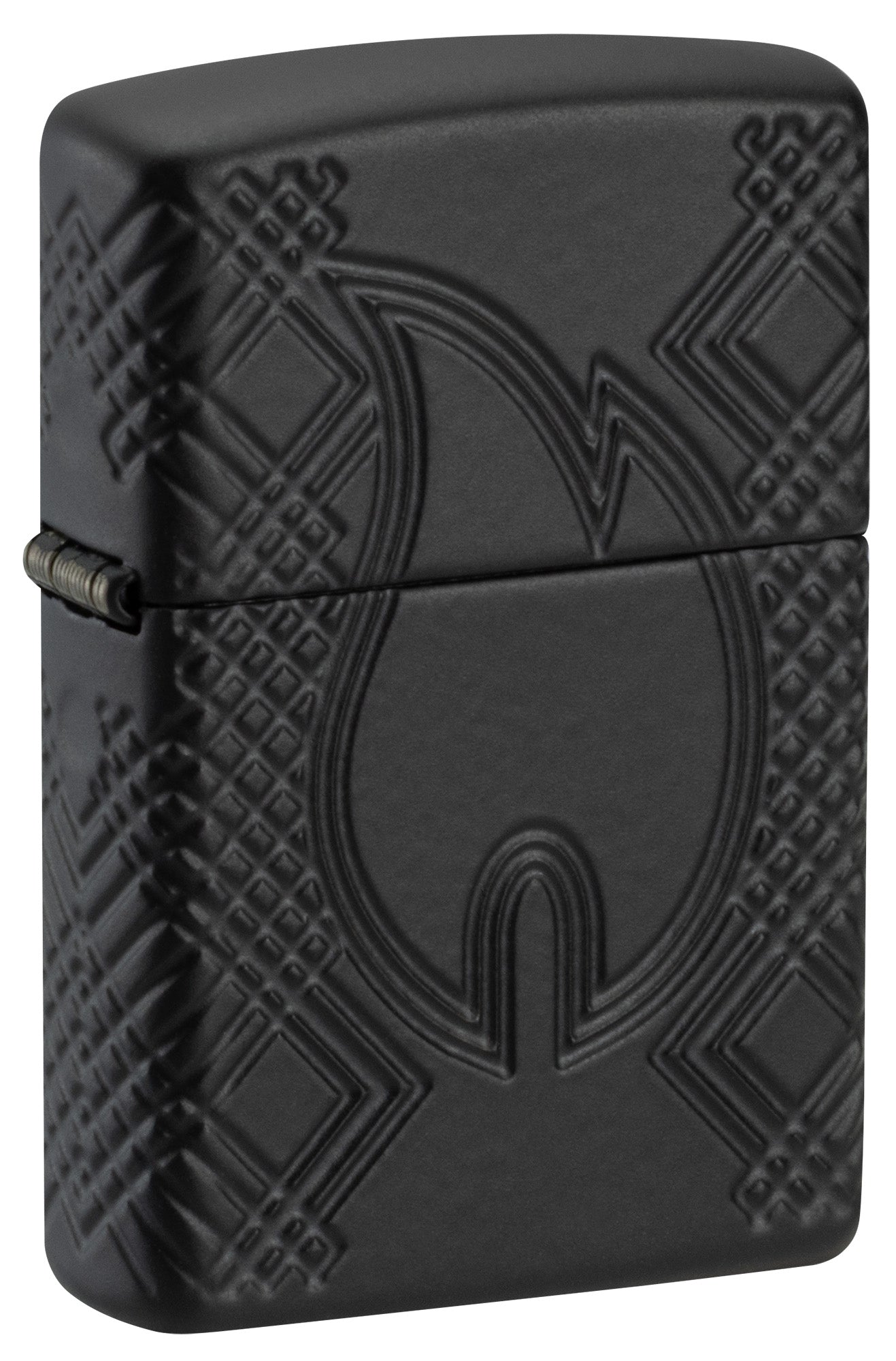 Das Zippo Flammensymbol ist auf diesem Armor®-Feuerzeug in mattem Schwarz mit edlem MultiCut-Design von einem reich strukturierten Nietenmotiv umgeben, das sich um alle Seiten des Feuerzeugs zieht.