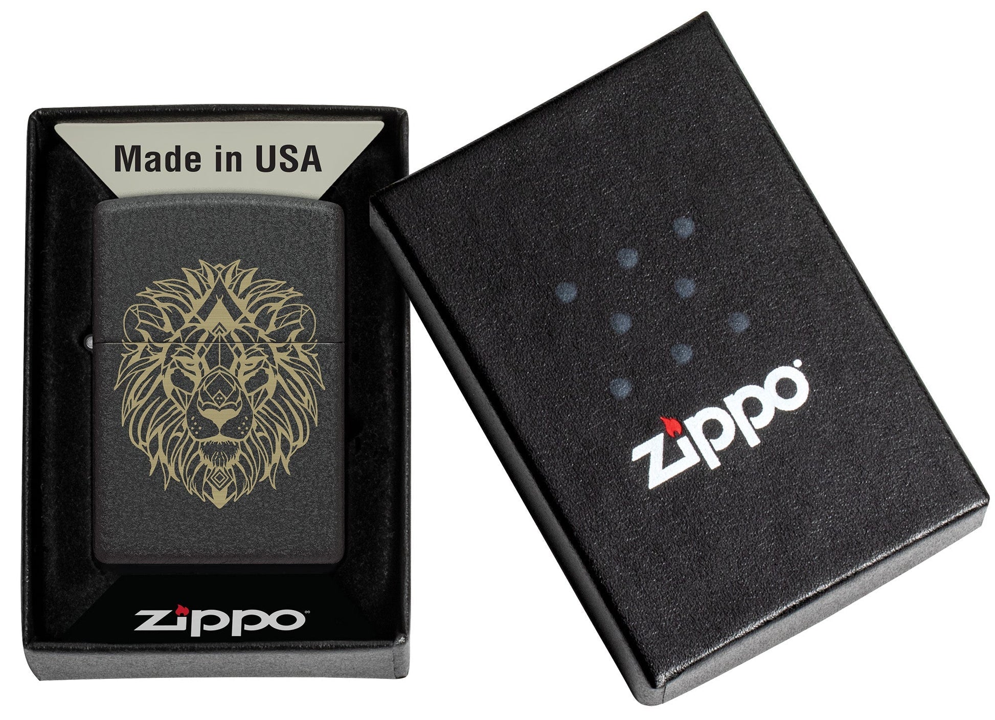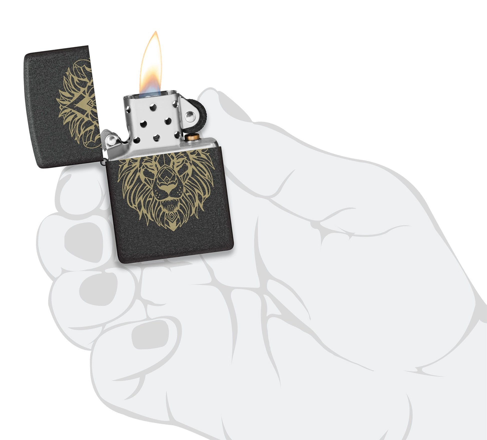 Komplexe Linien und Formen bilden auf diesem klassischen Black Crackle®-Feuerzeug einen perfekt symmetrischen Löwen in gestochen scharfer Lasergravur.