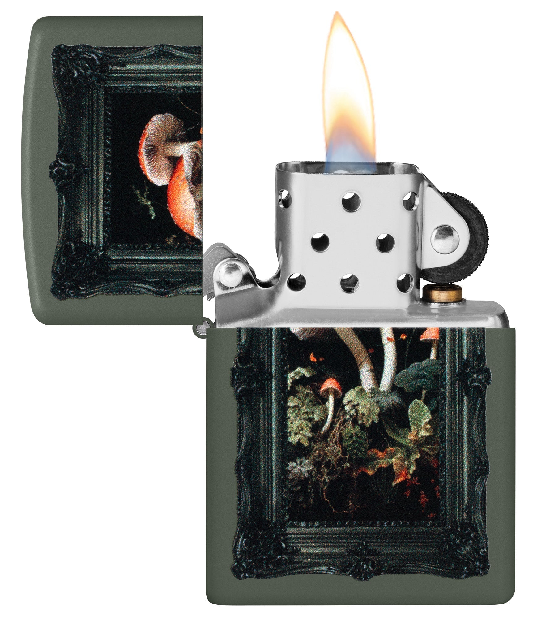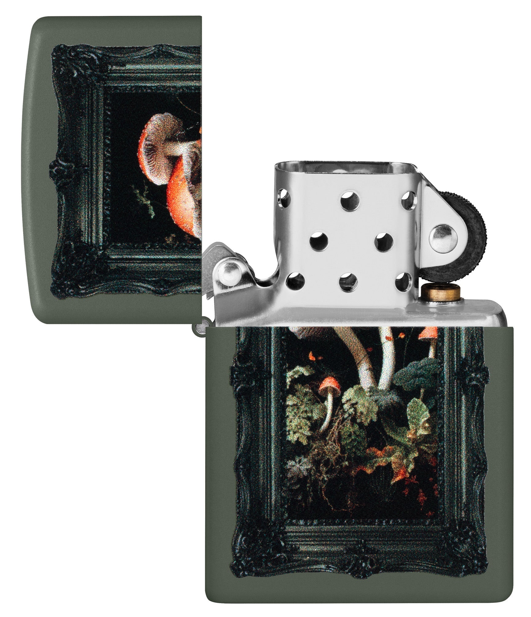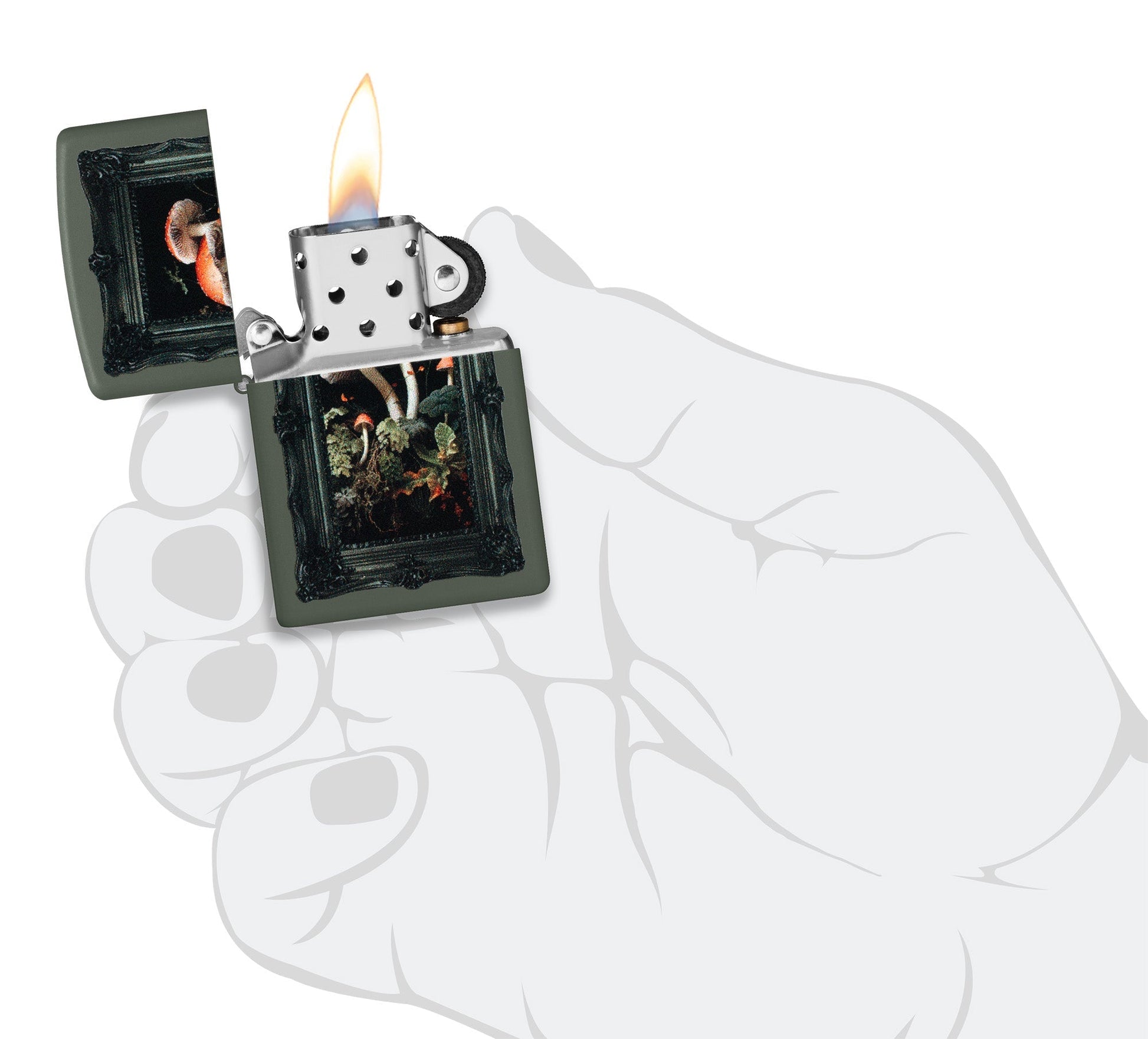 Ein bezauberndes Bild von leuchtenden Pilzen ziert dieses klassische Feuerzeug in mattem Grün einem verspielten Farbbilddesign.