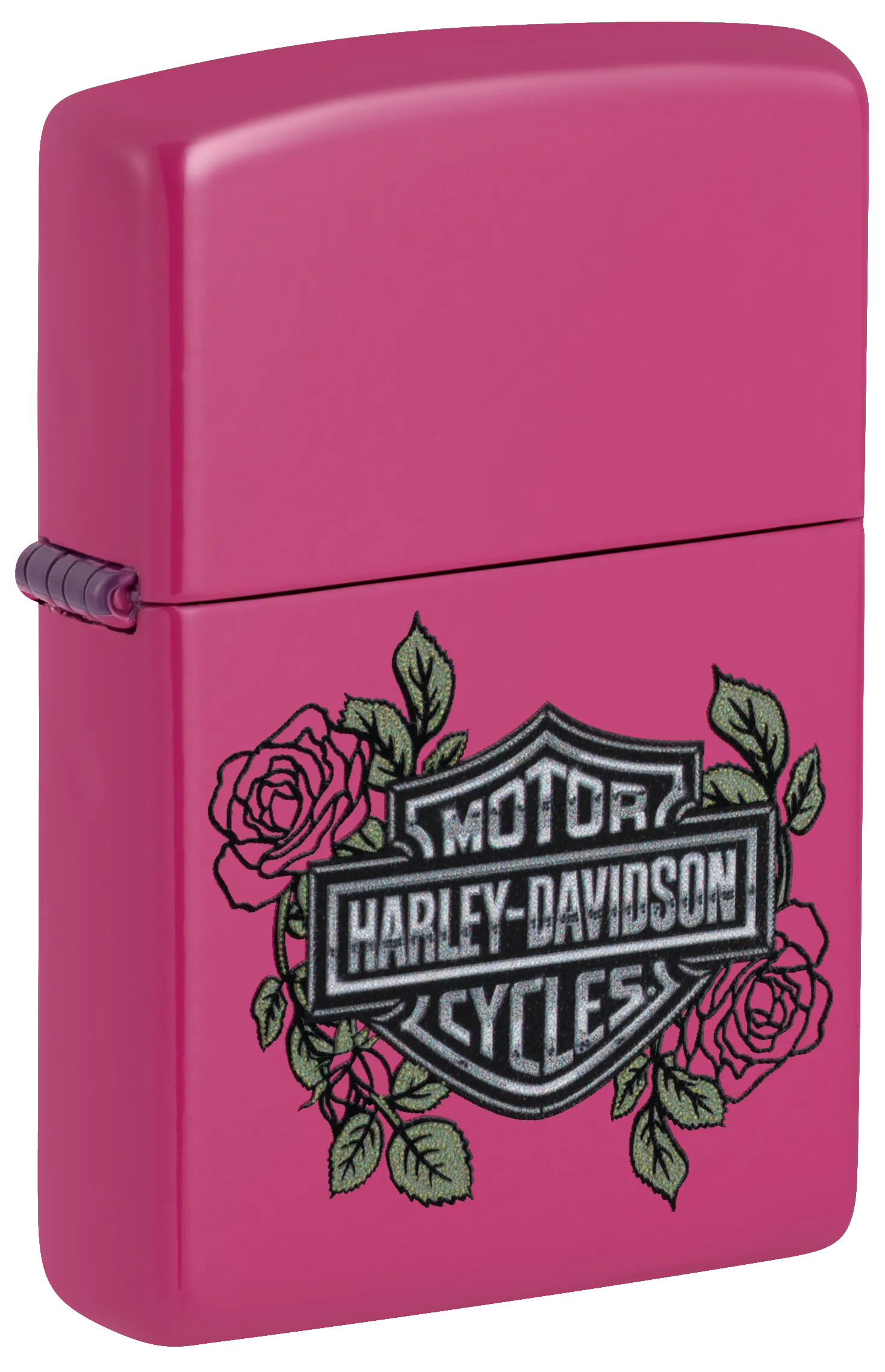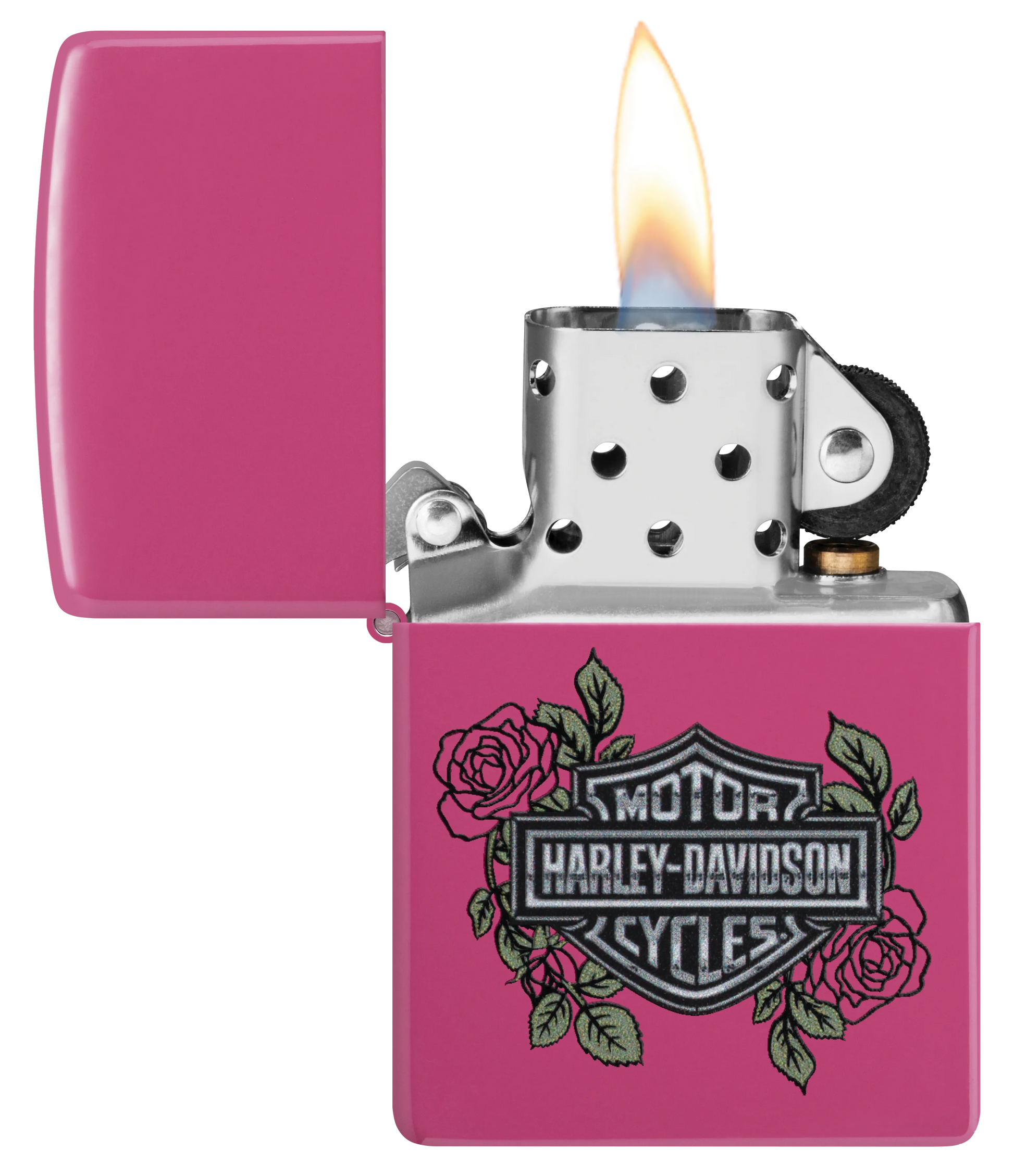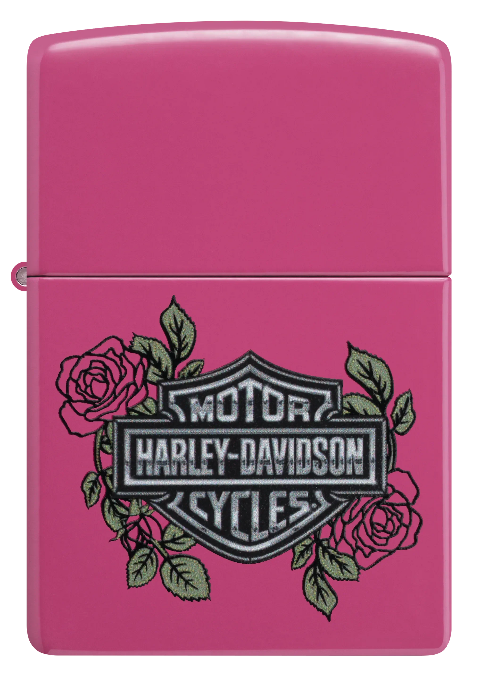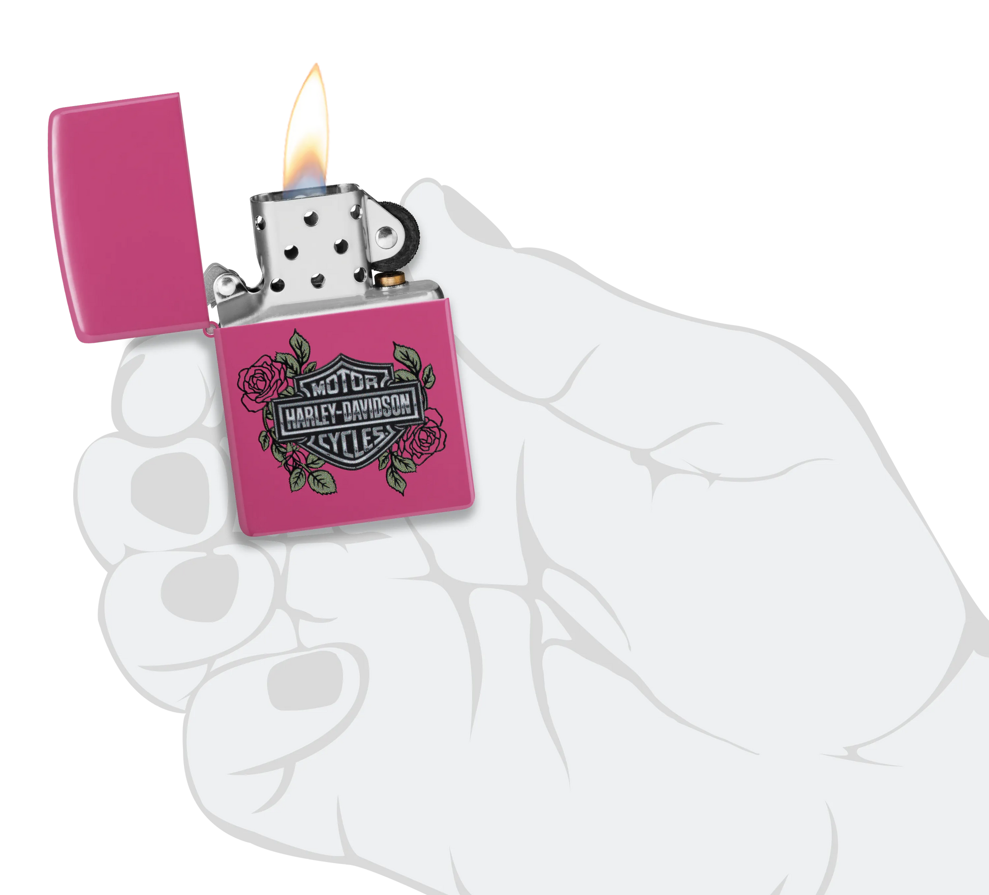 Dynamische Rosen schmücken das ikonische Harley-Davidson Bar-and-Shield-Logo in kräftigem Color Image-Design auf diesem Frequency-Feuerzeug in leuchtendem Pink.