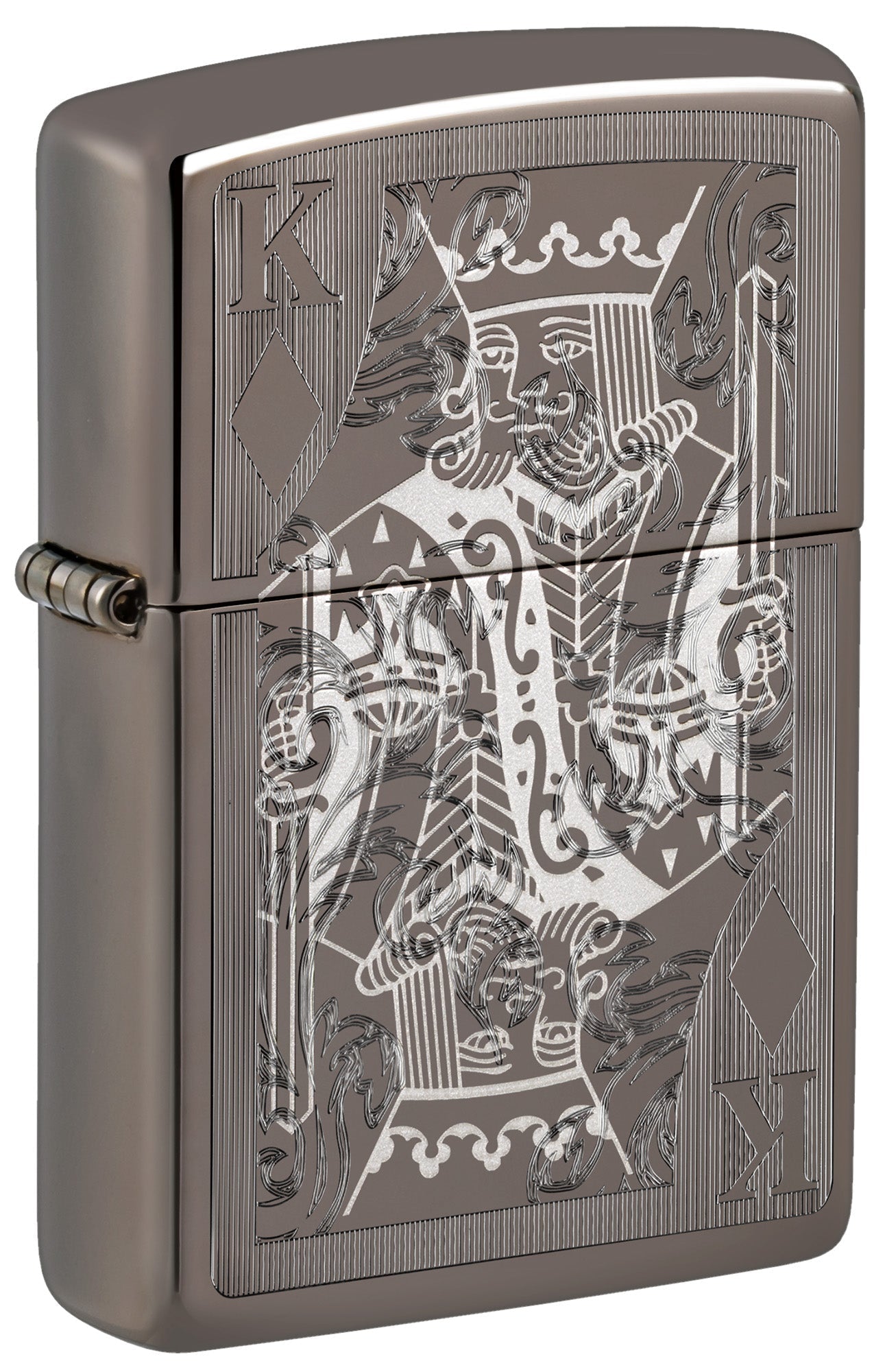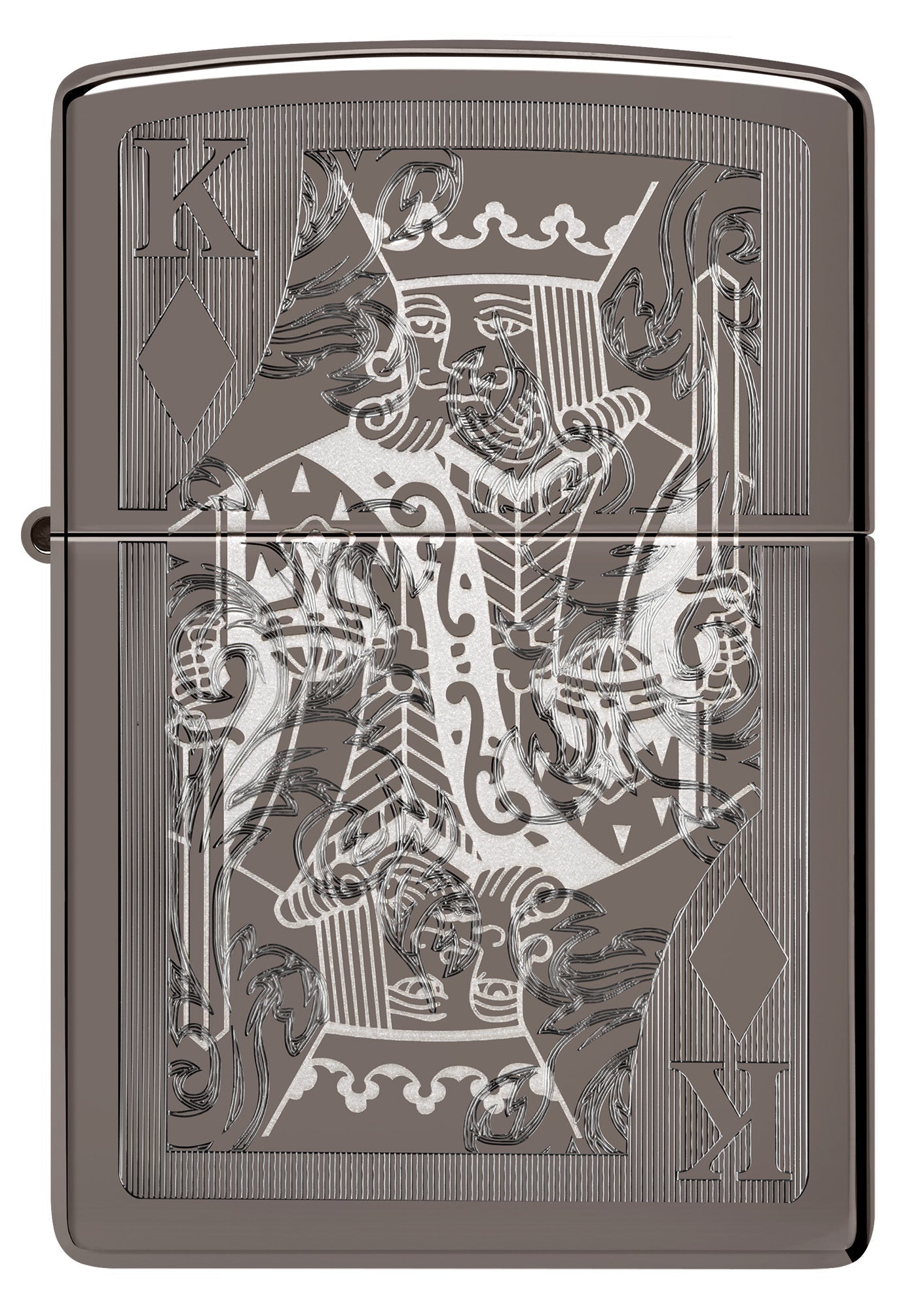 Lassen Sie dieses klassische Black Ice®-Feuerzeug Ihre Sammlung beherrschen. Das aufwendige Motiv des Karo-Königs, das mit unseren automatischen und Lasergravurverfahren auf die glatte Oberfläche geprägt wurde, sorgt für edle Tiefe und Kontrast.