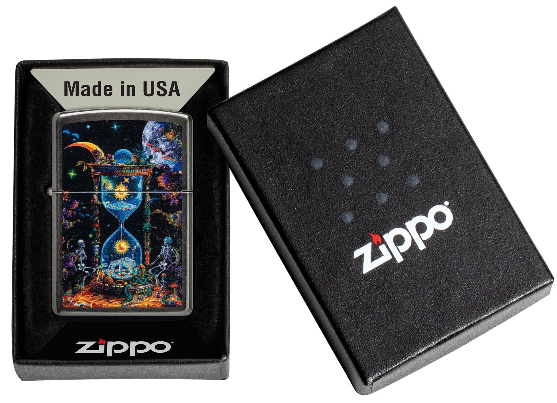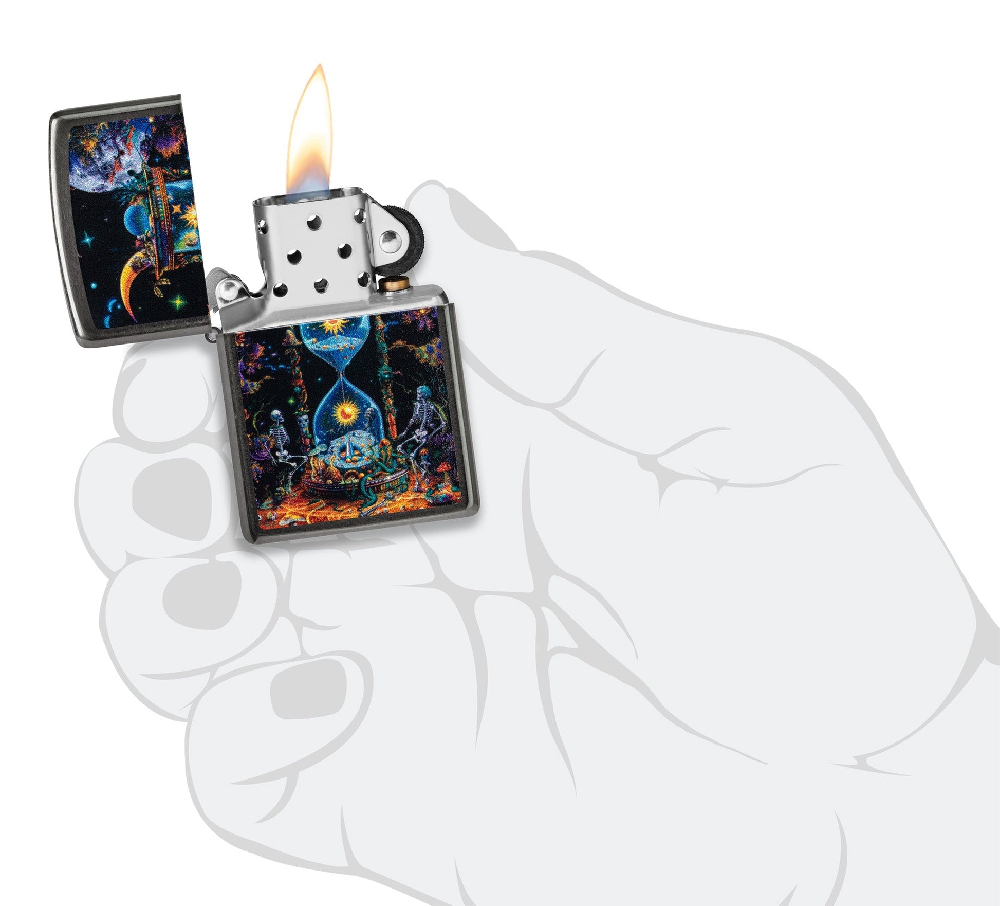 Leben, Tod und Kosmos erscheinen auf diesem klassischen grauen Feuerzeug in perfekter Balance. Zeit und Raum bilden eine ewige Sanduhr in einem mystischen Farbbilddesign.