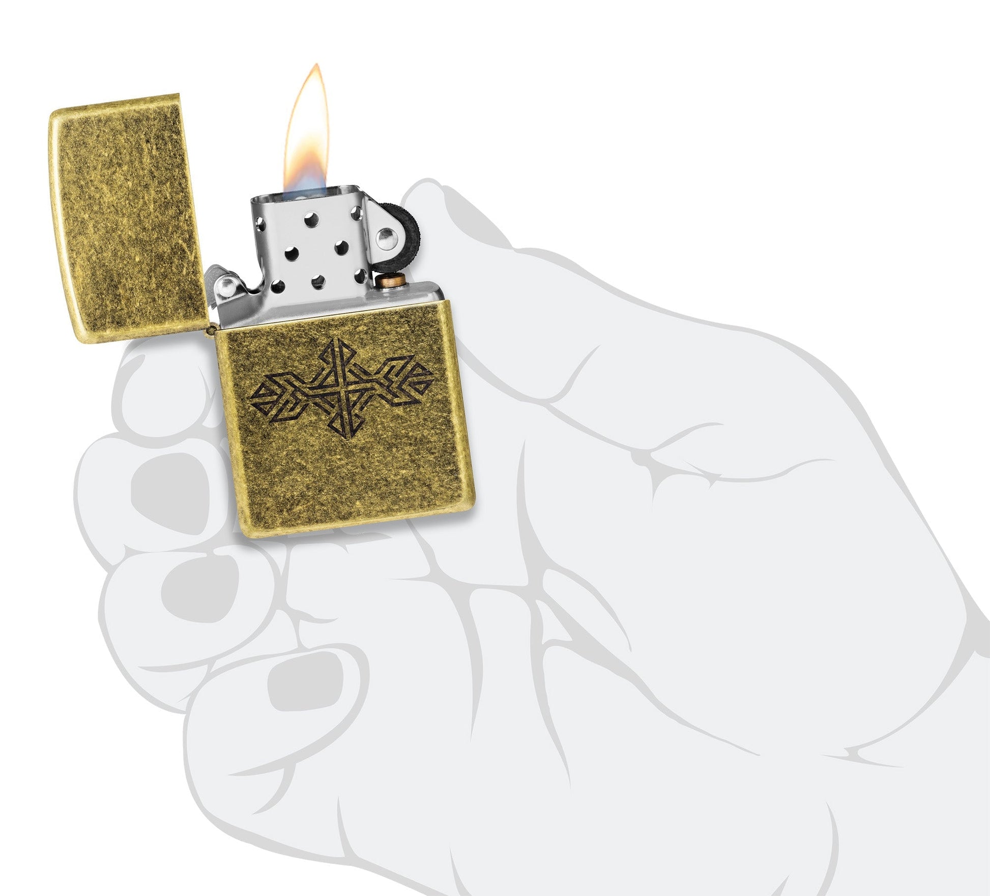 Inspiriert von alten nordischen Runen wurde dieses klassische Feuerzeug in antikem Messing mit einem einfachen mittelalterlichen Symbol in einem dezenten Glanzdesign graviert.