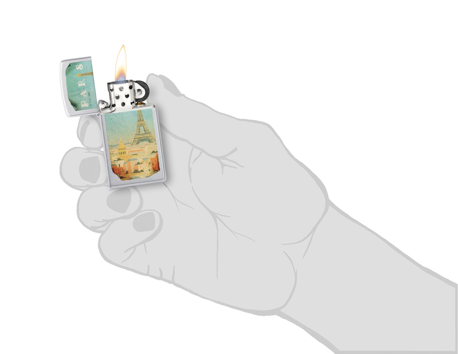 Besuch die Stadt der Lichter mit diesem eleganten Feuerzeug in Slim Satin Chrome. Das gedämpfte Color Image-Design zeigt das ikonische Stadtbild unter der Aufschrift „Paris“, in die der prächtige Eiffelturm integriert ist.