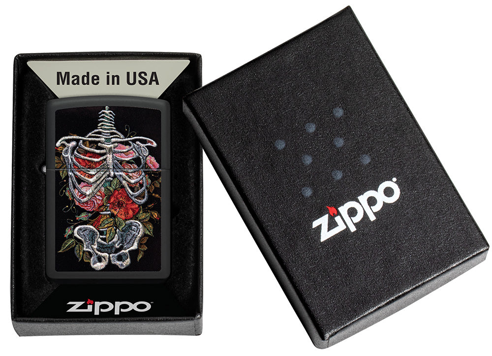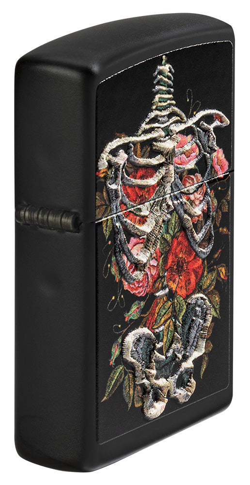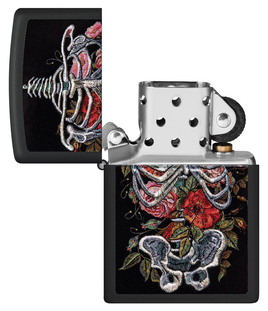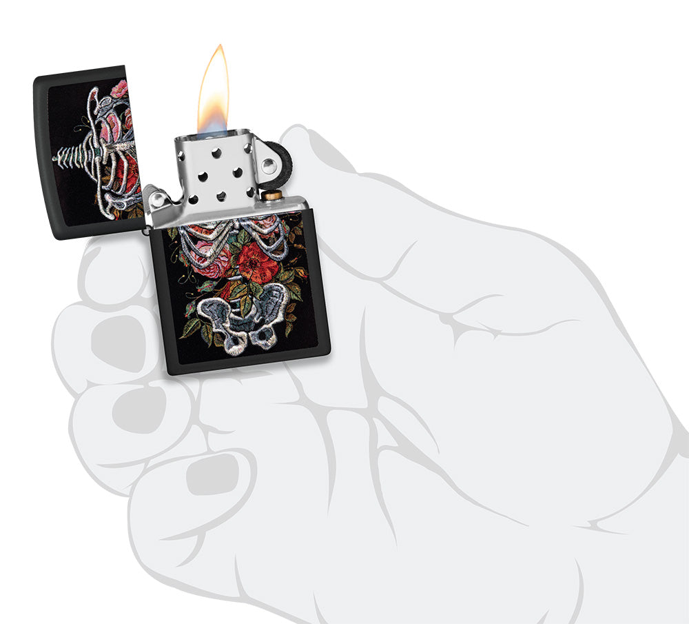Dieses wunderschöne Feuerzeug in Black Matte ähnelt einer detaillierten Stickerei und zeigt ein Skelett auf einem Bett aus leuchtenden Blumen. Das düster-romantische Design erhebt sich mit unserem Texture Print-Verfahren aus der Oberfläche des Feuerzeugs.