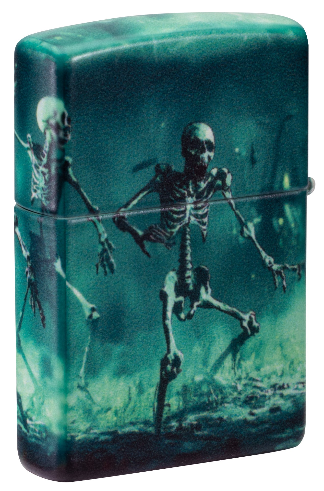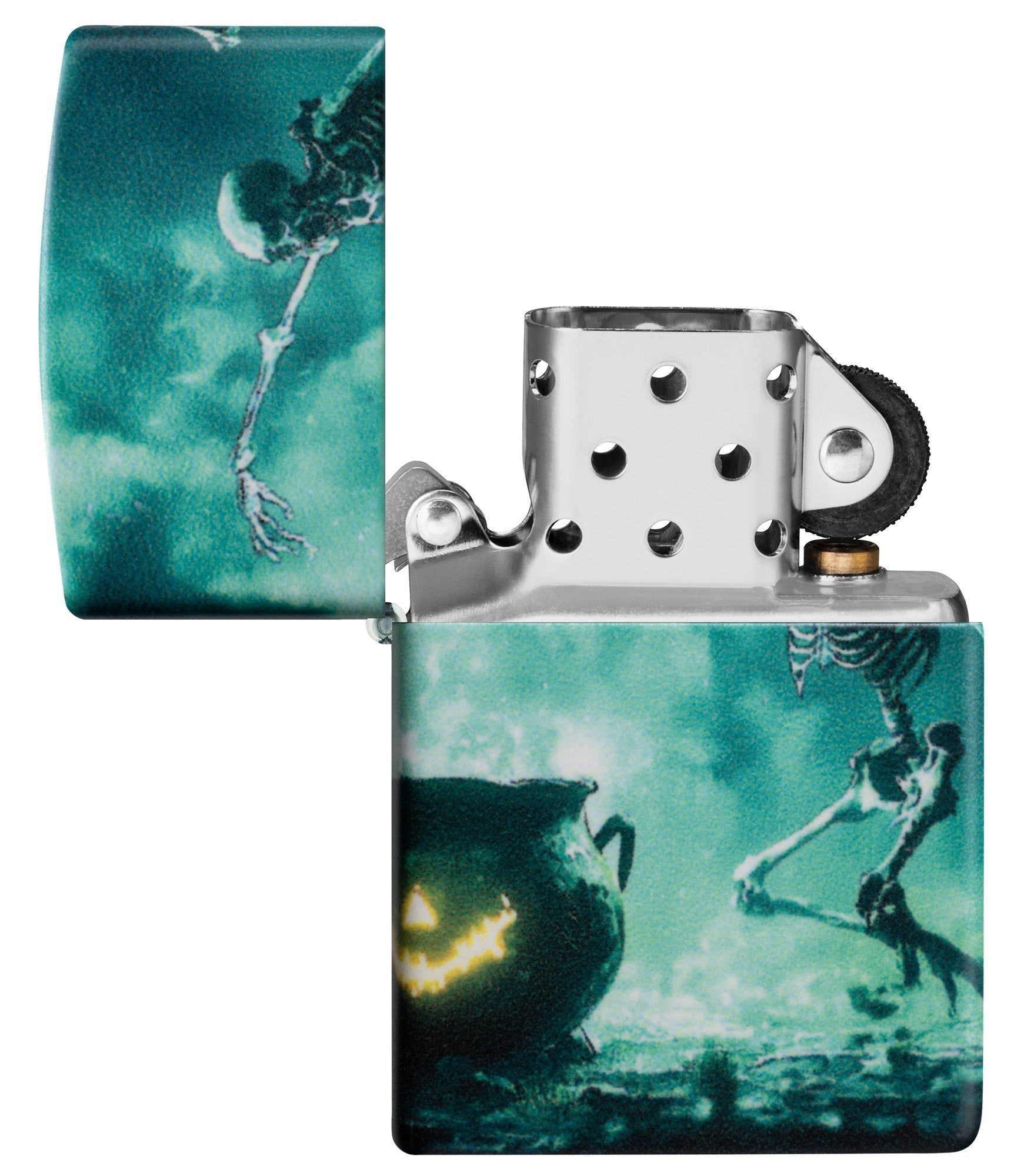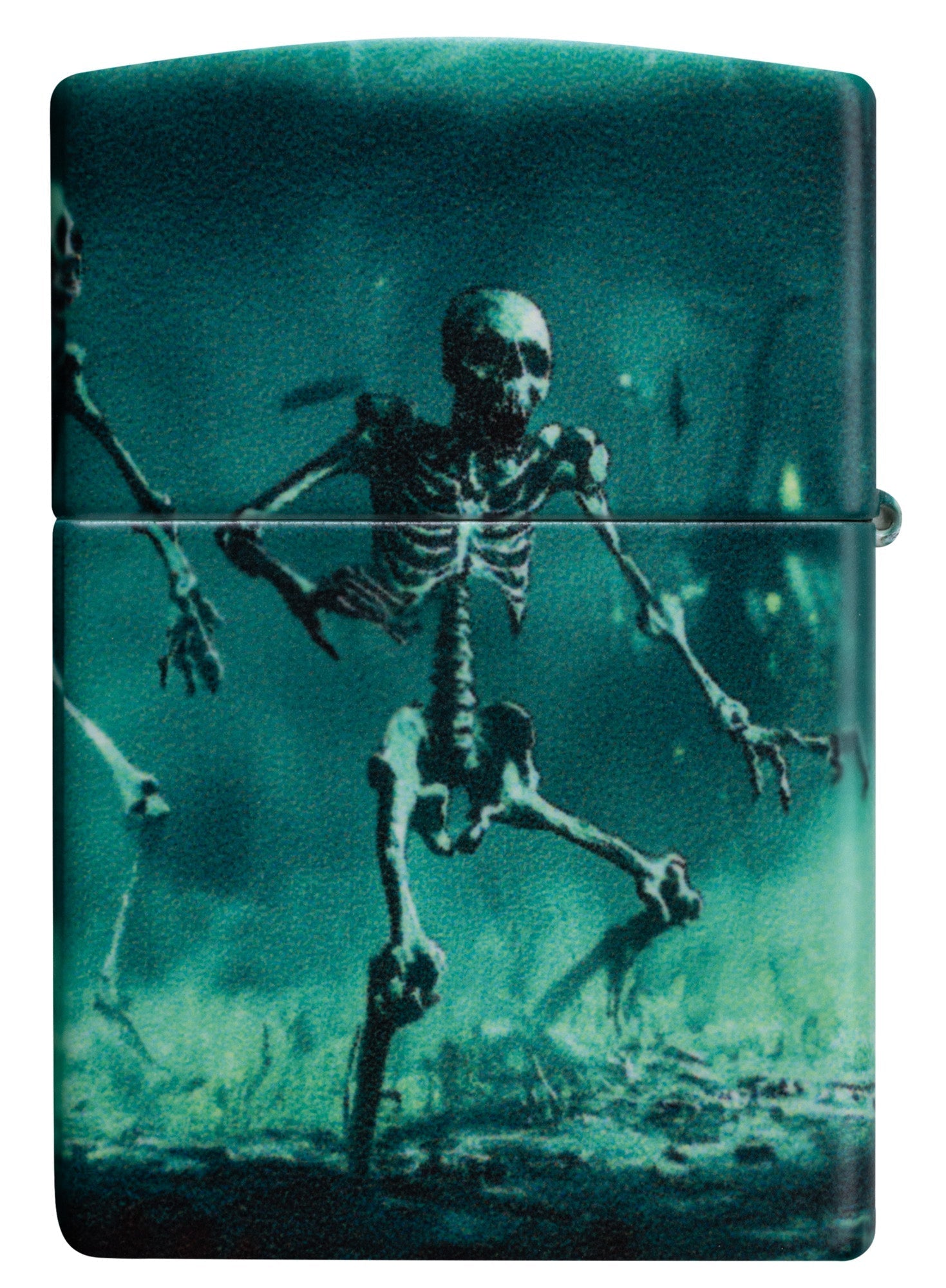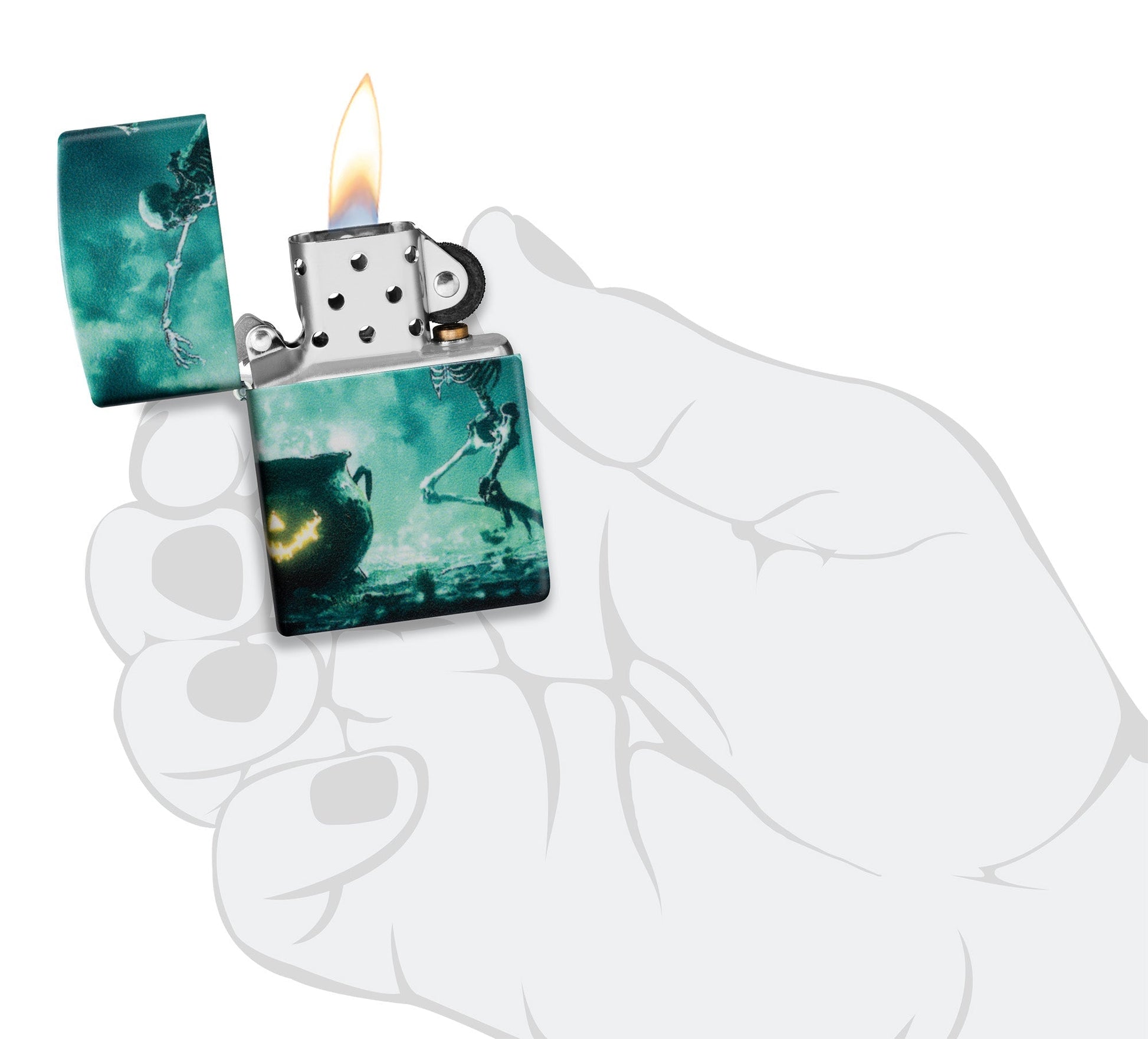 Eine Gruppe von Skeletten tanzt auf diesem klassischen 540-Farben-Feuerzeug in einem herrlich gruseligen Design um einen brodelnden Kessel. Als zusätzlicher Reiz wurde das Motiv mit unserer speziellen, im Dunklen leuchtenden Oberfläche versehen.