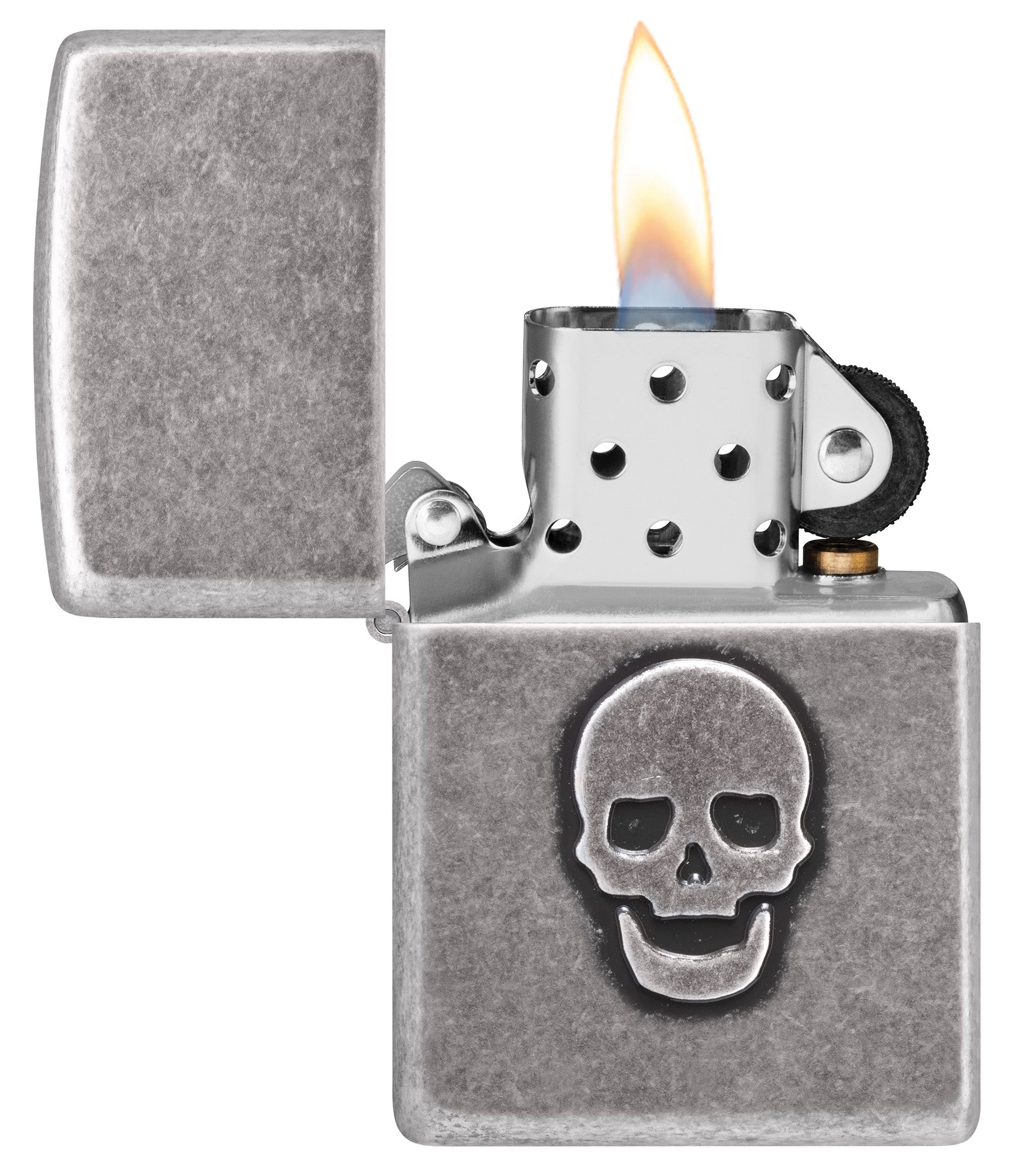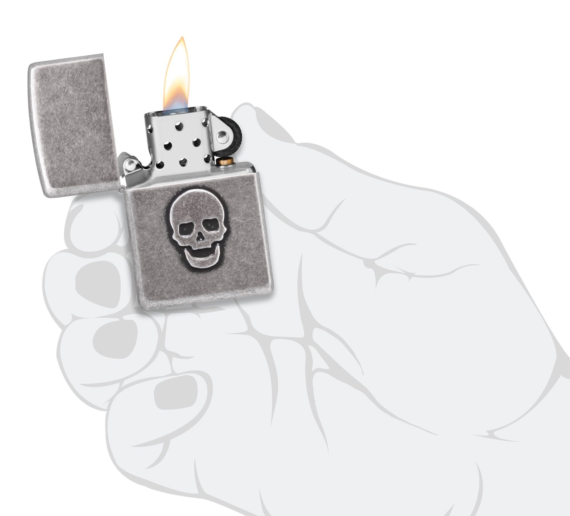 Auf die Oberfläche dieses klassischen Feuerzeugs in Altsilber wurde ein schlichter Totenkopf geprägt. Er verleiht der eleganten Oberfläche subtile Tiefe und Struktur.
