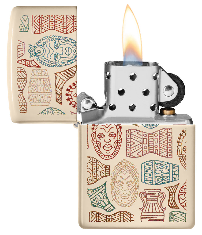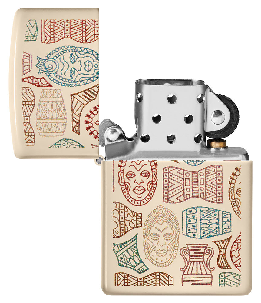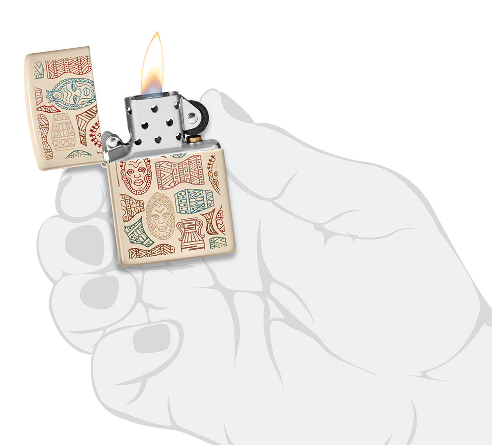 Die sandfarbene Oberfläche verleiht dem Feuerzeug eine natürliche und zugleich moderne Ästhetik. Das tribal inspirierte Symbol, das in lebendigen Farben auf dem Feuerzeug abgebildet ist, strahlt eine kraftvolle Ausstrahlung aus und zieht alle Blicke auf sich.