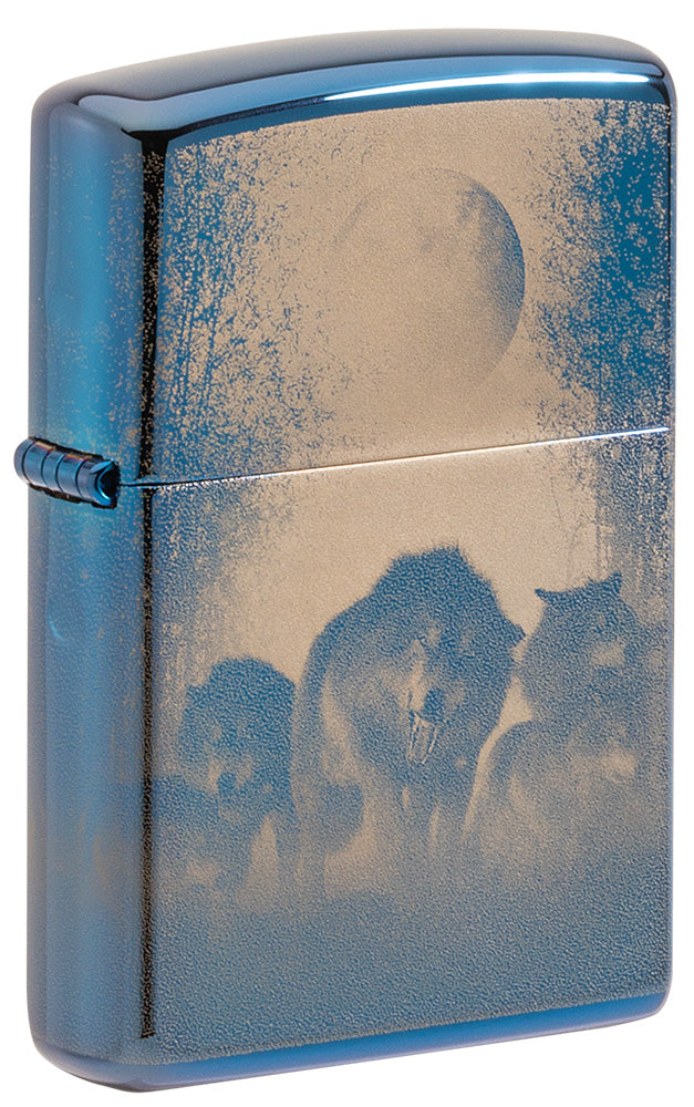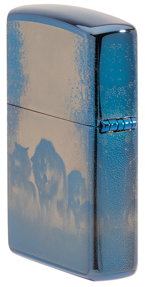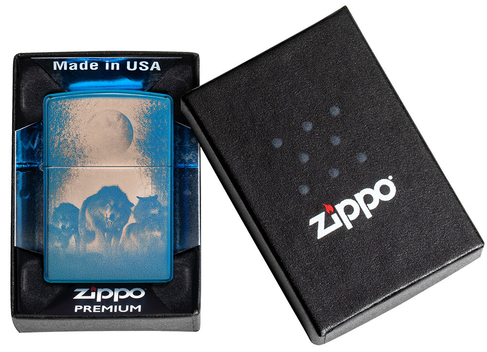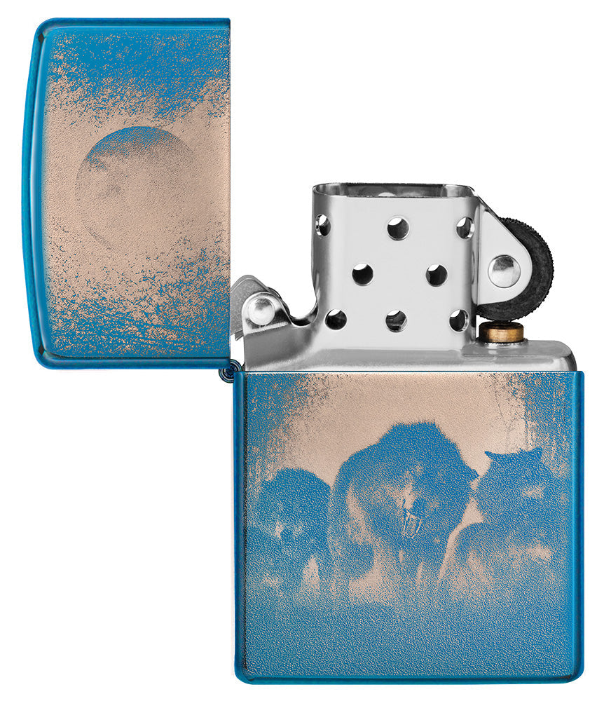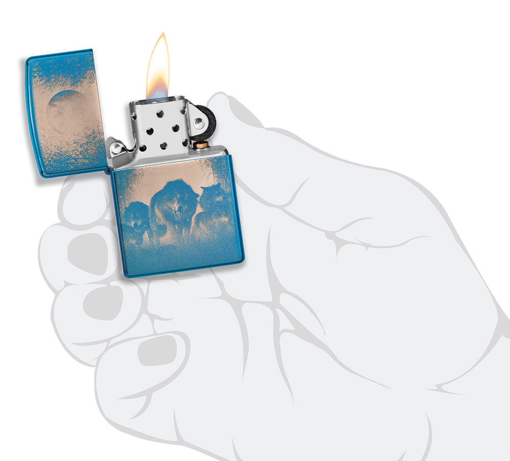 Die hochglanzpolierte blaue Oberfläche verleiht dem Feuerzeug einen edlen und ansprechenden Look. Das detailreiche Foto des Wolfsrudels und des Vollmonds erzeugt eine fesselnde Atmosphäre und fängt die wilde Schönheit der Natur ein.
